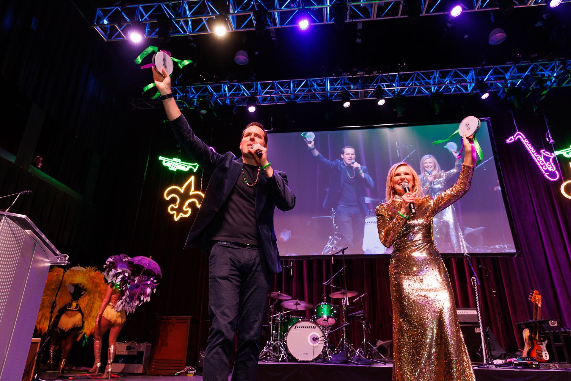 To bring Bourbon Street to life, we layered entertainment throughout the room. Costumed dancers greeted guests and energized the crowd, while a six-piece brass band played at arrival and later roved the event, culminating in a lively second line parade captured via IMAG.